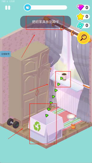2、需要将物件进行收纳,界面上方显示当前资金与任务情况。