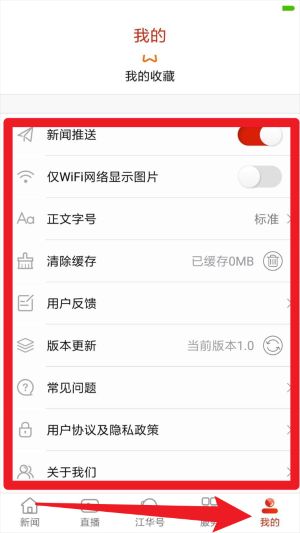 3、在我的页面可管理新闻推送、图片显示、字体字号、清除缓存、用户反馈、查看用户协议与隐私政策等功能。