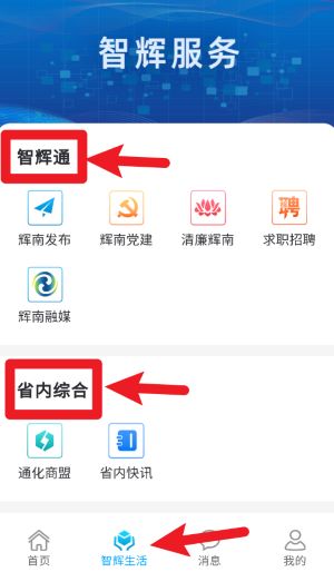 3、在智辉生活页面中选择智辉通或省内综合等模块,进入后可使用各类便民服务功能。