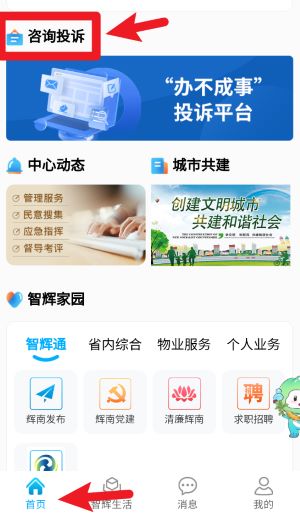 4、返回首页点击咨询投诉进入办不成事平台,查看管理服务及文明城市共建的相关内容与动态。