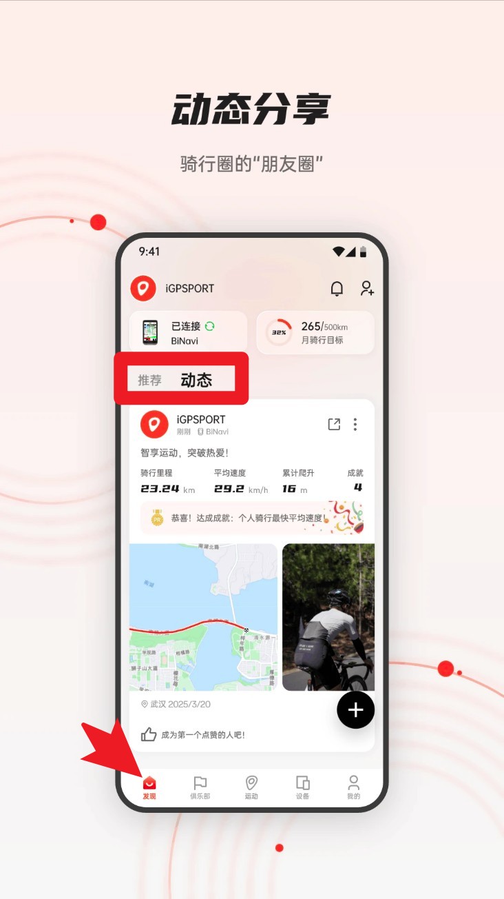 2. 登录成功后进入首页,点击底部导航栏发现,可进入骑行动态区,浏览他人发布的路线、打卡图文内容,互动评论同步更新。