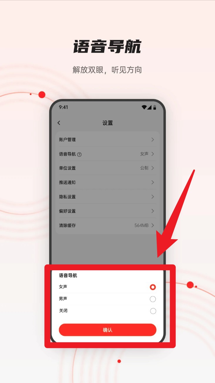 5. 若需启用语音导航功能,可前往设置页面找到语音导航选项,自由切换男女声或关闭,确认后即会在骑行时实时语音提示路线。