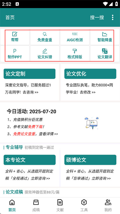 1、打开论文帮APP,首页上方提供免费查重、AIGC检测、智能降重等核心功能;