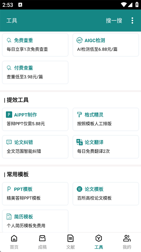7、工具页提供更多论文写作相关工具,含查重、提效及模板功能。