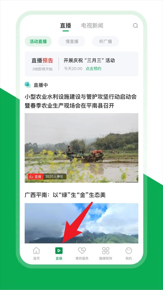2、点击直播进入直播板块,可预约或观看新闻直播、慢直播与电台广播等多种内容形式。