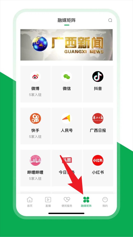 3、点击融媒矩阵可查看本地媒体矩阵入口,快速跳转微型部落格、抖音、快手等平台取得内容。