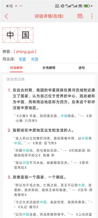 3、系统将呈现词语释义与造句范例,可自行添加补充说明;