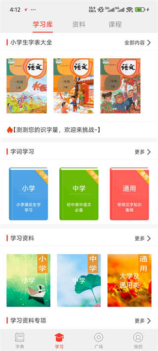 4、进入“学习”模块,可浏览小学识字表、词汇资料及知识拓展内容。