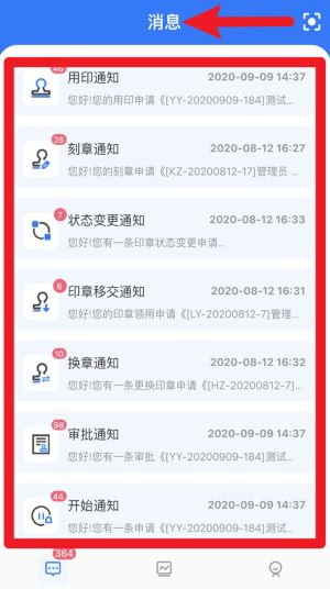 2、在消息页面中可查看各类系统通知,包括用印、刻章、状态变更等消息,方便用户及时掌握申请进度。