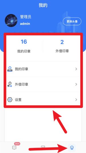 4、点击右下角我的图标后,可查看当前管理员信息,并能进入我的公章、外借公章、设置等个性化管理界面。