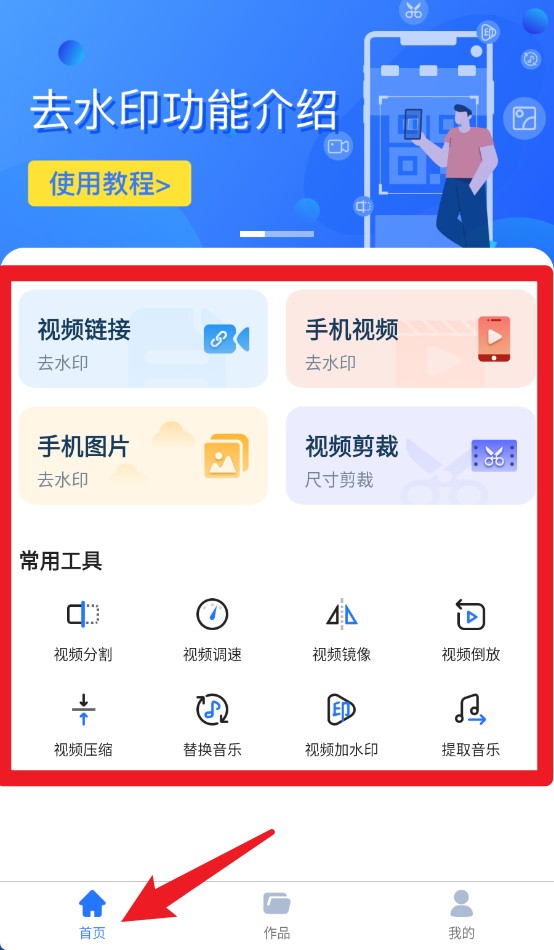 2、首页集合多种常用视频工具,可对链接、手机视频及图片进行一键去水印处理。