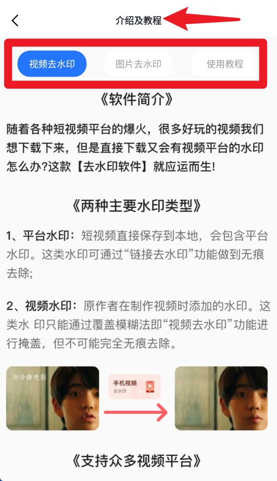 3、点击介绍及教程可查看去水印原理及操作指引,了解平台与视频水印的差别。