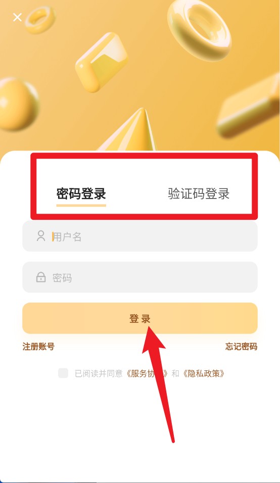 1、登录页面提供密码与验证码两种登录方式,输入用户名与密码后点击底部按钮即可完成登录。