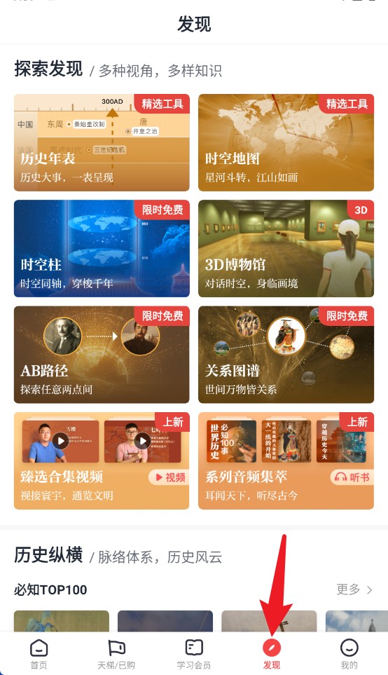 4、发现页整合限时免费精品工具和内容,如时空地图、3D博物馆、系列音频等,拓展知识获取方式。