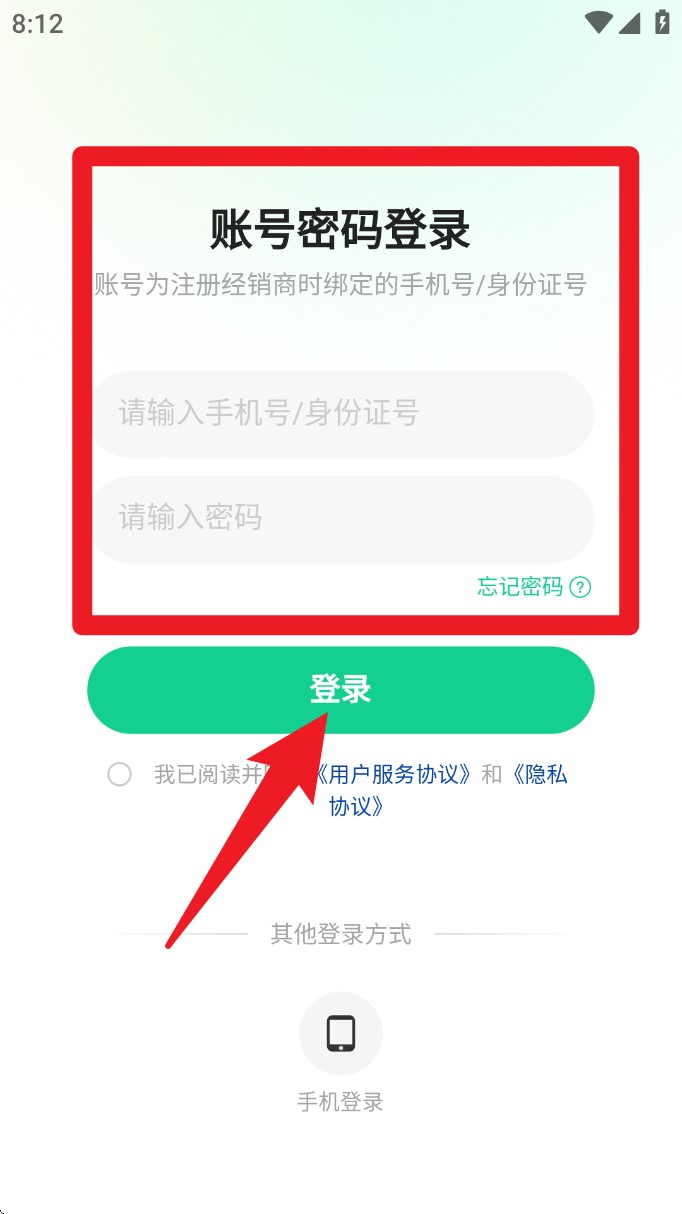 1. 打开App后选择账号密码登录,输入手机号和密码并勾选协议,点击登录进入系统主界面。