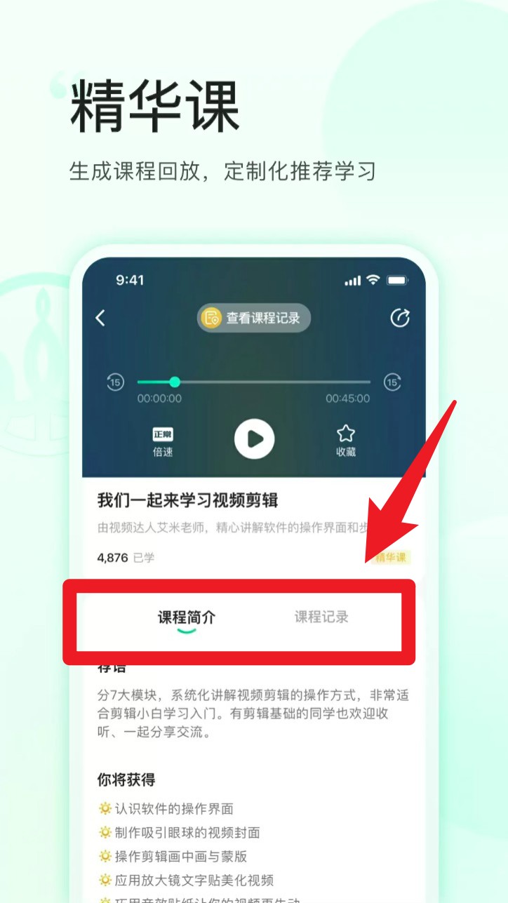 5. 点击已学习课程进入精华课界面,可查看课程简介、回放视频和学习记录,反复巩固所学内容。