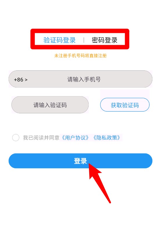 1、选择验证码登录或密码登录方式,输入手机号和验证码后点击登录即可。