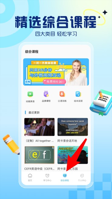 4、精选综合课程分类清晰,用户可根据兴趣选择适合的外教课程进行在线学习。