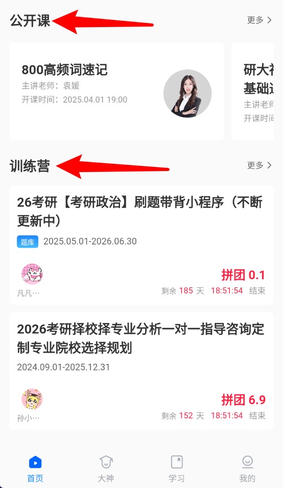 3、页面中部可查看公开课与训练营板块,涵盖课程时间、主讲老师及团购信息等内容。