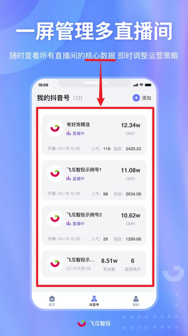 飞瓜智投app是一款服务于直播间运营工作的综合效率软件,专注于直播数据实时追踪、主播工作表现评估、直播内容回放分析。使用者能够通过它来随时查看直播间观众来源途径、观看者互动行为、推广转化效果等关键数据,支持按不同时间区间查看主播工作成果、自动保存、同步直播过程录像,提升运营团队协同工作的整体效率。