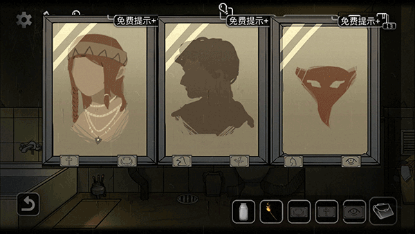 1、在马桶中获得【卡片:牙】。洗衣机上恶魔相框上获得【卡片:眼】【卡片:猫】。女子相框上获得【卡片:十字】【卡片:叶子】。镜像中男子相框里获得【卡片:鸟】。