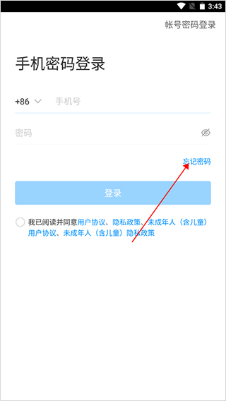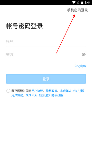 1、打开应用进入登录页面,点击右上角【手机密码登录】;