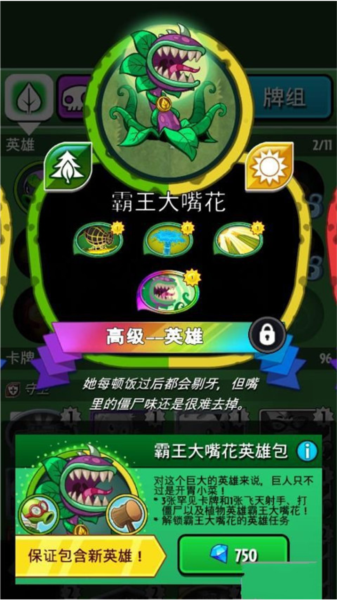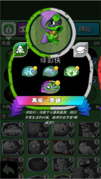 选择的卡牌有南瓜、大喷菇、混合坚果、火焰豌豆、卷心菜投手、向日葵、肥料、能量花束和激光豆这几张。在能力上主要是可以获得攻击属性的提升,从而战胜各种各样的敌人。
