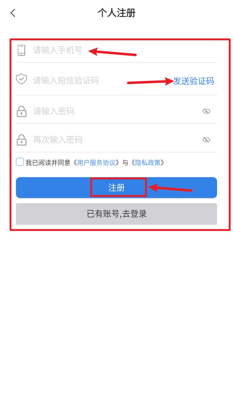 2. 输入手机号、验证码及密码后,勾选协议并点击注册按钮完成账号建立。