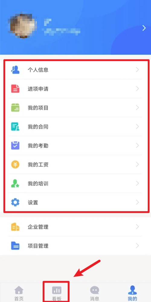 3. 注册成功后返回首页,点击底部看板标签页进入个人与项目功能页。