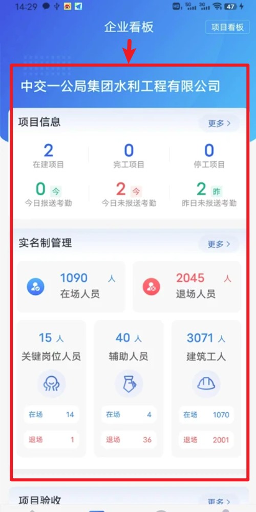 5. 进入企业看板后,即可查看项目统计、出入场人数、实名管理等关键数据。