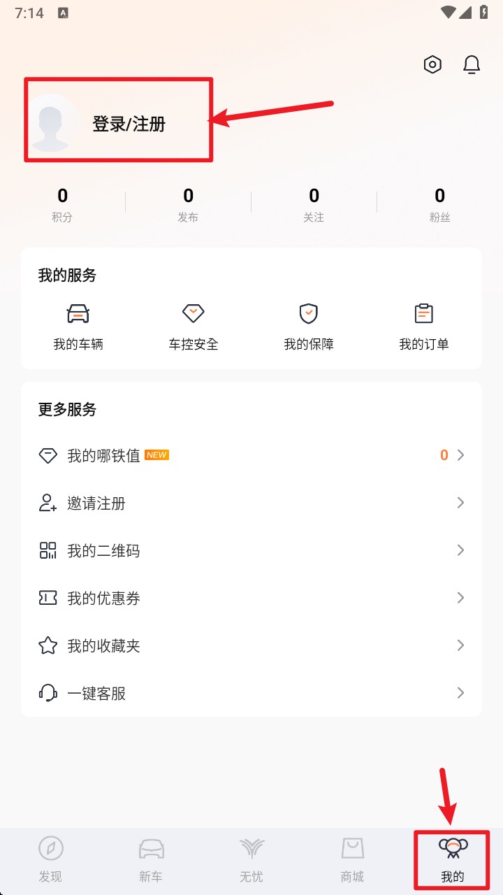 1. 打开App并点击右下角我的标签页,进入个人中心后点击顶部的登录、注册开始绑定操作。