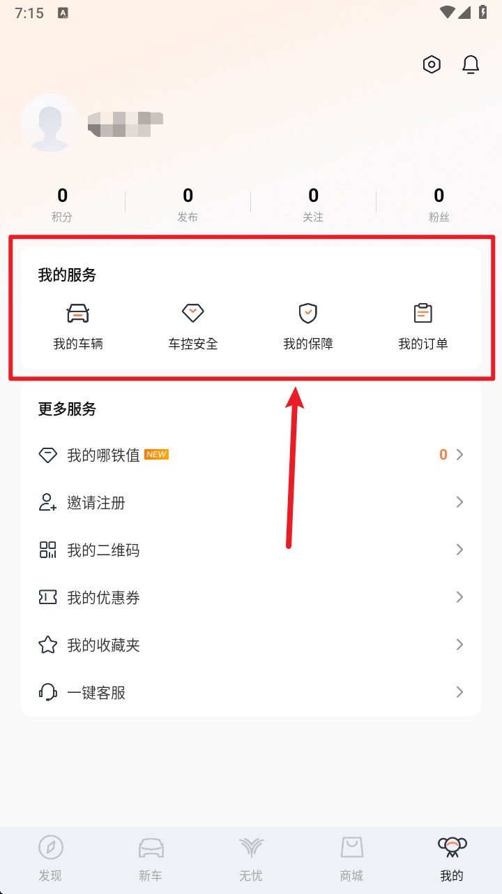 3. 登录成功后返回我的页面,可依序查看我的车辆、车控安全、我的保障与订单等服务入口。