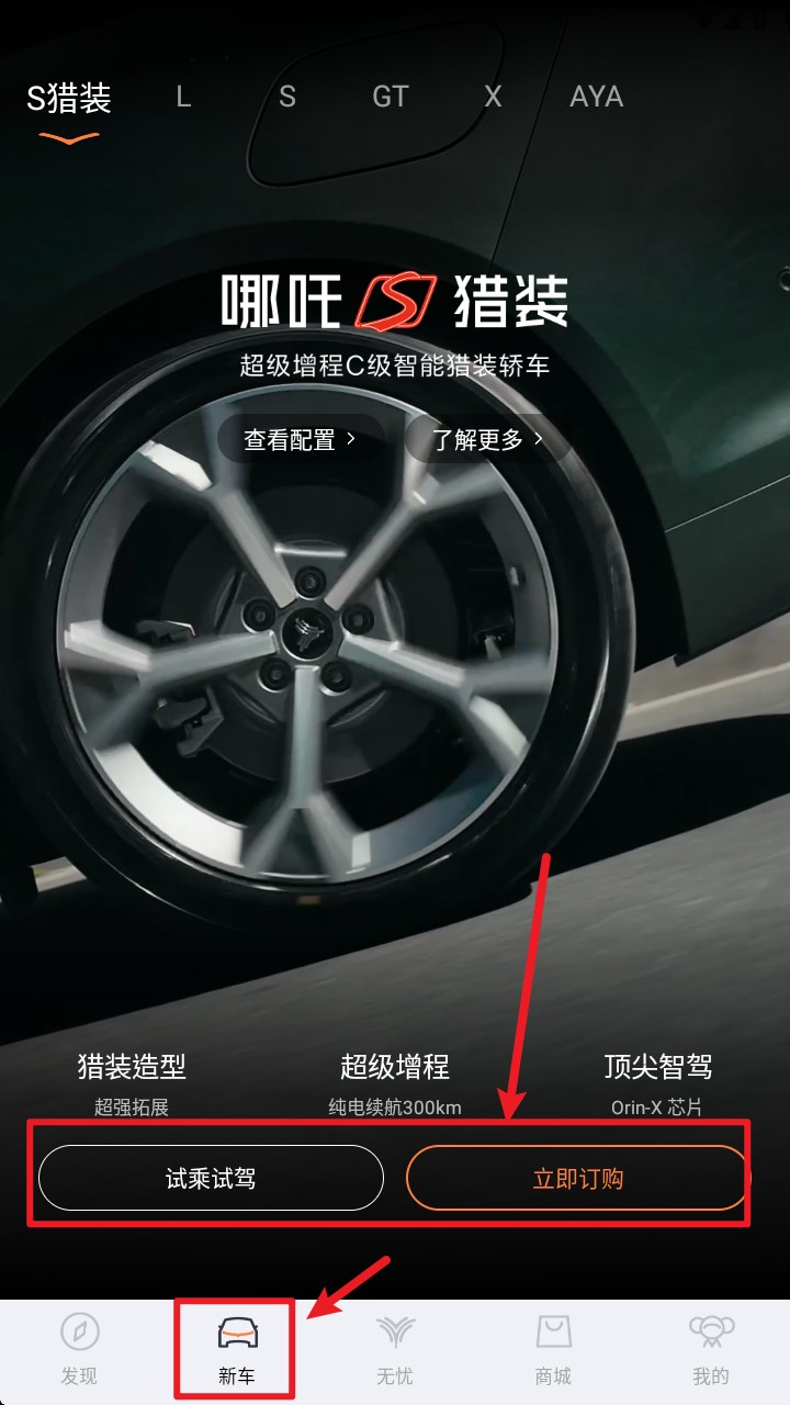 4. 点击底部新车选项进入车型展示页,挑选目标车款后可发起试驾申请或立即下订流程。