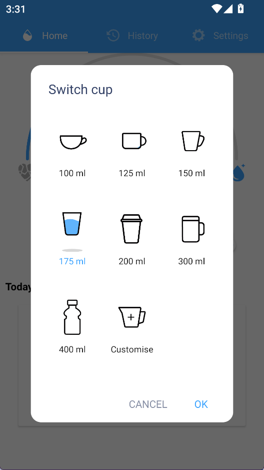 3、点击右侧的水杯按钮可以设置使用的水杯容量
