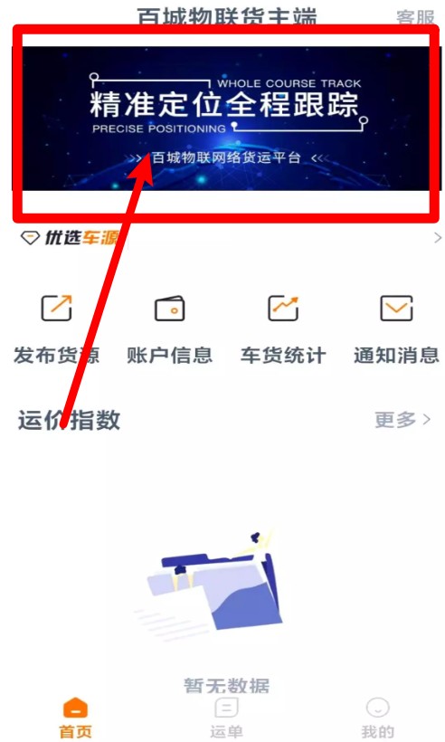 1.打开APP首页,顶部显示精准定位全程跟踪广告,点击可了解更多功能。