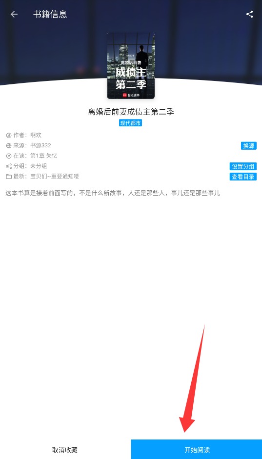 2、在搜索结果中找到目标小说后,点击进入详情页,选择右下角的开始阅读按钮进入阅读界面。
