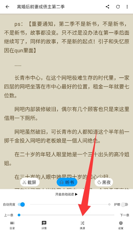 3、阅读过程中轻触屏幕中央,调出底部功能栏,点击换源选项即可切换不同的书源,选择加载最快的线路。