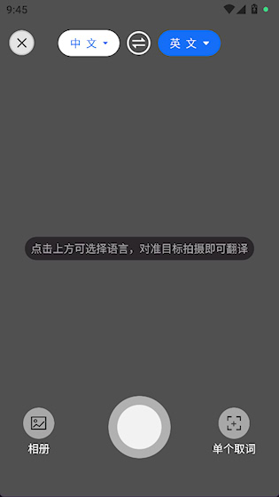 2、拍照翻译界面提供了相册导入和单个取词功能