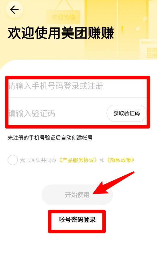 1、输入手机号并填写验证码后,点击开始使用即可完成登录或注册,支持切换为账号密码登录方式。
