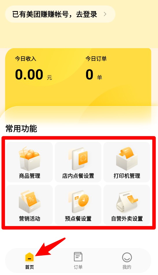 2、进入首页可查看今日收入与订单概况,下方常用功能区包含商品管理与店内设置等入口。