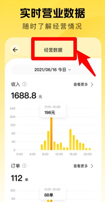 4、点击经营数据可查看当天收入订单详情,通过柱状图了解各时段运营状况。