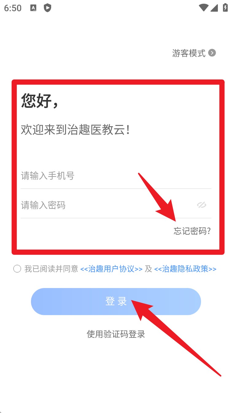 1. 打开App后进入欢迎页面,输入手机号与密码登录账号,或勾选下方协议后点击登录按钮。