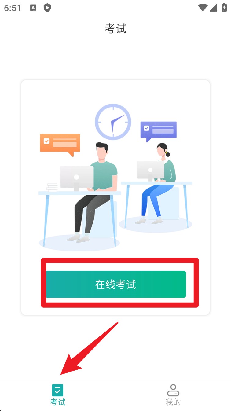 4. 登录成功后,点击底部考试选项卡,进入考试模块并选择在线考试参与模拟或正式测试。