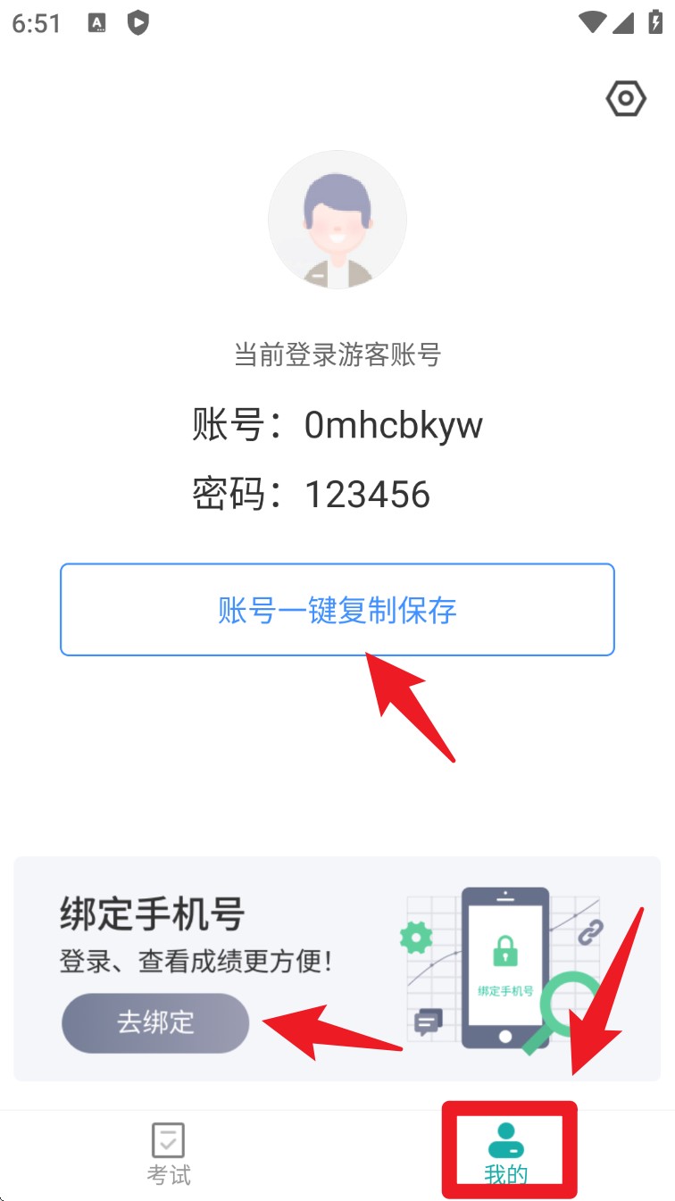 5. 在我的页面中查看当前账号信息,可一键复制游客账号并选择绑定手机号以便保存成绩。