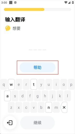 5、除常规单词选择练习外,设有翻译单词板块,遇难题可点击帮助,完成当前关卡即可进入下一关。