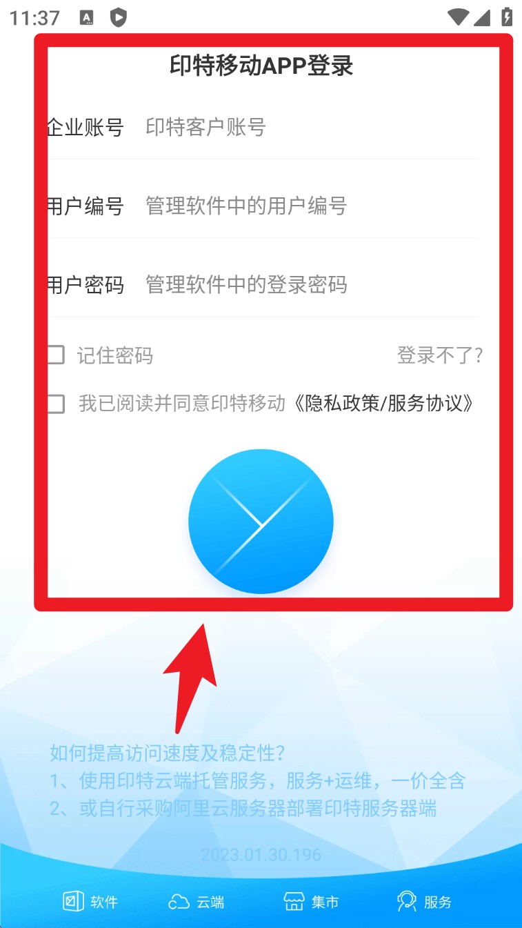 1. 打开App之后,输入企业账号、用户编号和密码,勾选同意协议后完成登录。