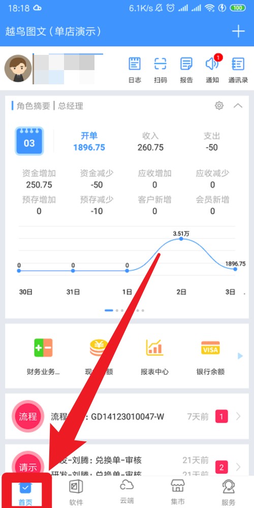 3. 进入云端标签页,可查看营业概况、开单统计与财务流程信息,掌握经营动态。