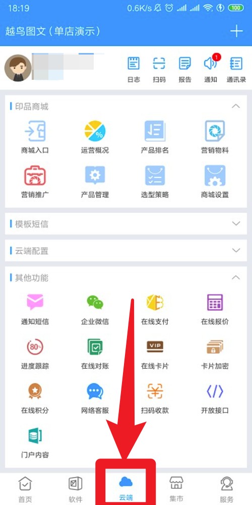 4. 点击底部云端按钮,可使用商城入口、产品设置、营销推广等相关功能。