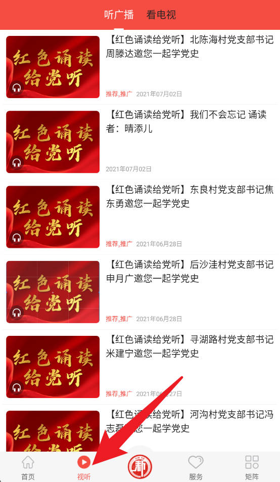 2、在视听页面,您可以收听红色诵读、观看相关视频,通过丰富的音频与影像资源了解更多的专题信息。