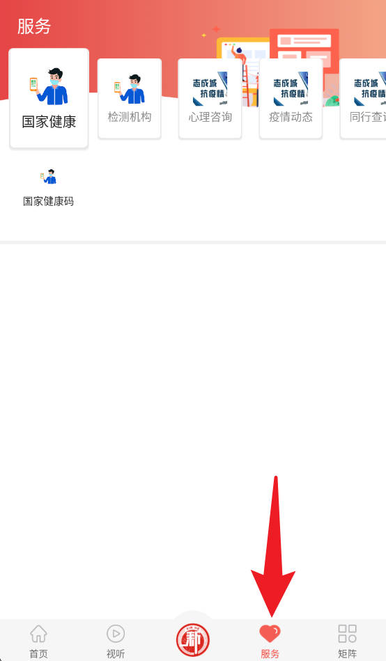 4、在服务页面,您可使用国家健康码、检测机构查询、心理咨询等功能,并随时掌握病情动态与相关便民服务。